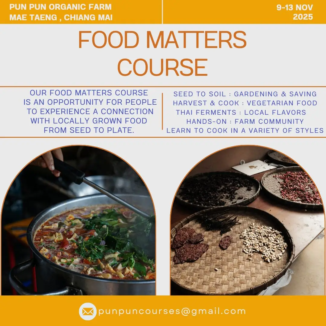 Pun Pun will be hosting one Food Matters course at our center in Mae Taeng, Northern Thailand, near Chiang Mai. Course is taught in English language Our Food Matters course is an opportunity for people to get to experience a connection with locally grown food from seed to plate. In this course we focus on food, in every stage from growing to harvesting to preparing, fermenting and consuming. This course if for foodies who are passionate about learning more about growing and preparing food, particularly from this part of the world. We will cover local and market plants, get our hands in the garden and also in the kitchen. And eat a lot! Techniques and Topics: The whole workshop will be very hands-on and focus on allowing participants to experience every topic themselves.